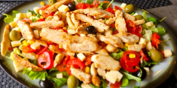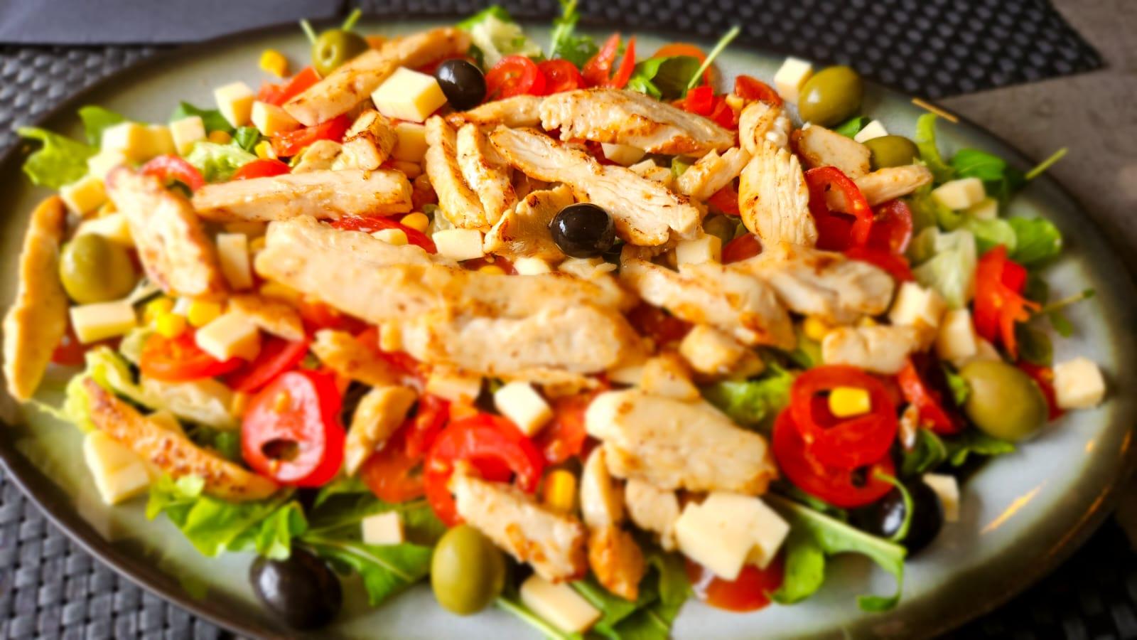 (mix sez. salata, krastavci, cherry rajčica, kukuruz, pečena piletina, dimsi)