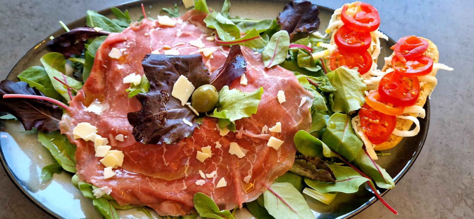 (mix sez. salata, grana padano, carpaccio od bifteka, mozzarella, cherry rajčice,bruschette, maslinovo ulje)